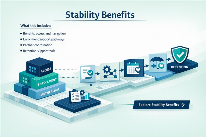Coordinating workforce onboarding, stability benefits, and Al-guided state resources-without replacing state systems.